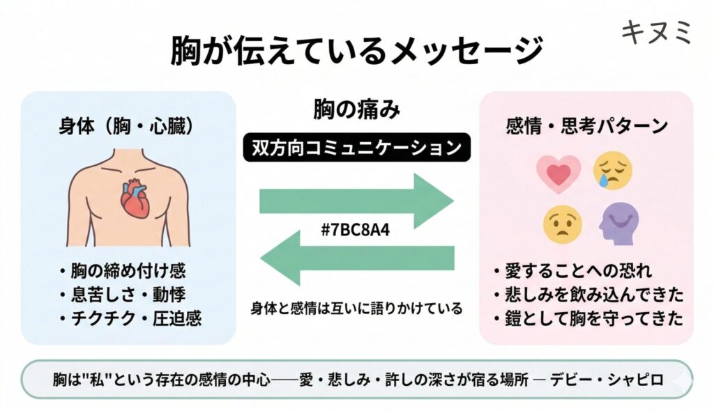 胸の痛みが繰り返されるのは、多くの場合「胸は、あなたの感情・信念・魂の中心——”私”という自己同一性そのもの——が宿る場所」だからです。