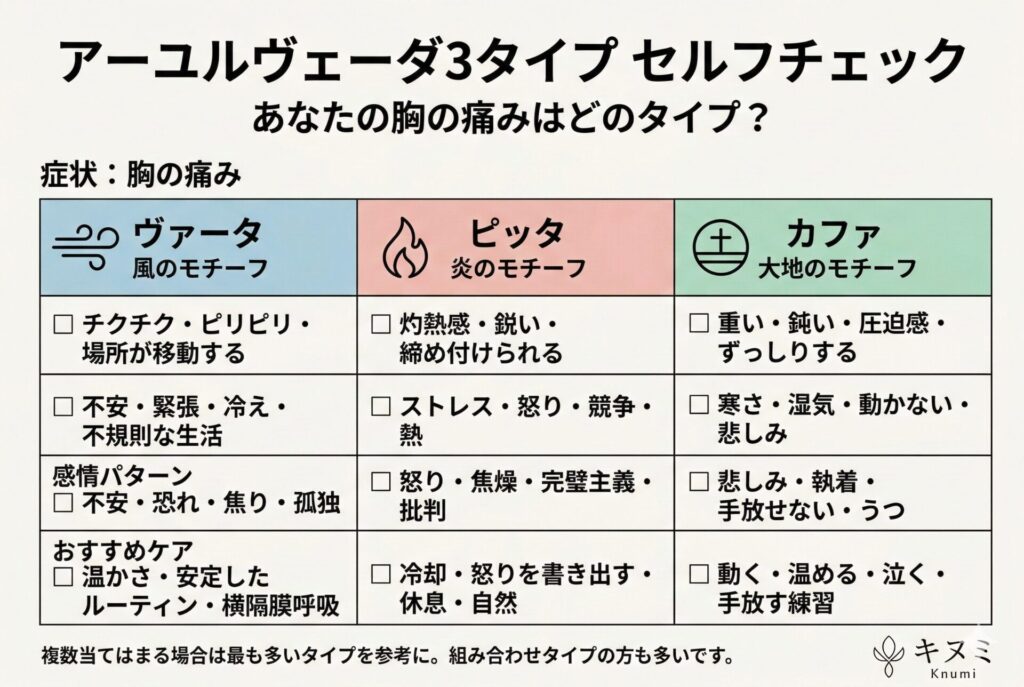 アーユルヴェーダでは、体質(ドーシャ)によって胸の痛みの現れ方が異なります。