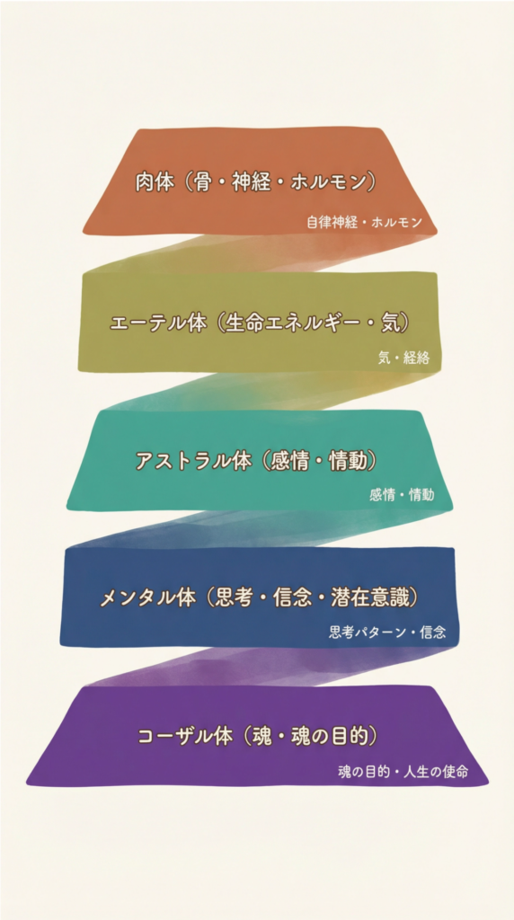 この層が届く深さ: 東洋医学は「神(しん)」という概念で精神・意識・思惟活動まで扱う体系です。経絡への鍼灸施術が思考パターンや感情の解放をもたらすことは臨床的にも確認されており、深く進むとアストラル体・メンタル体にまで届きます。