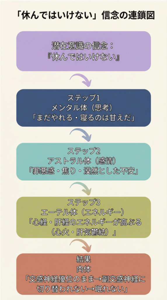 1. メンタル体(思考):「まだやれる、寝るのは甘えだ」「明日の準備が終わっていない」——思考が緊張し続ける。
