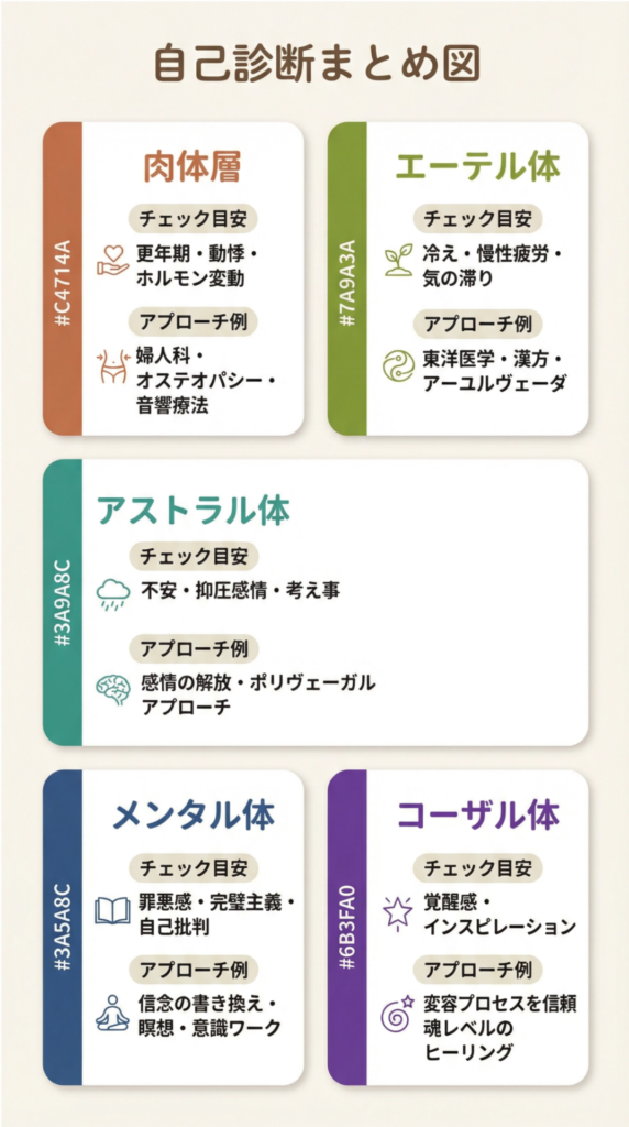 肉体層が多かった方へ: ホルモン変動・自律神経・構造的な問題が関わっている可能性があります。婦人科・内科・整体・オステオパシーへの相談、または音響振動療法など体に直接働きかけるアプローチが有効です。