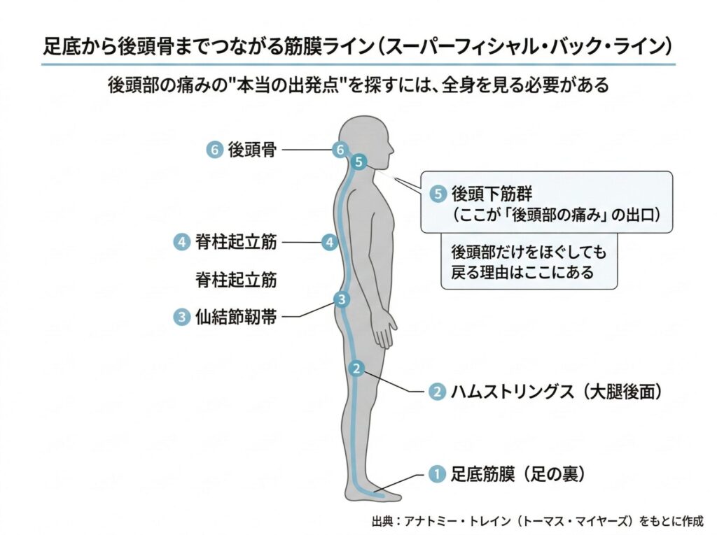 重要なことは、このラインはどこかが短縮すれば、別の場所にも張力がかかるという点です。デスクワークで骨盤が後傾し、ハムストリングスが短縮すると、その張力は仙骨→背中→後頭部へと順に伝播します。後頭部だけをほぐしても、線の他の部分の緊張が残っていれば、必ず「また戻る」のです。
