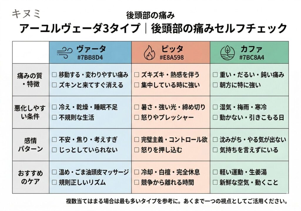 アーユルヴェーダ3タイプ別・後頭部の痛みパターンセルフチェック