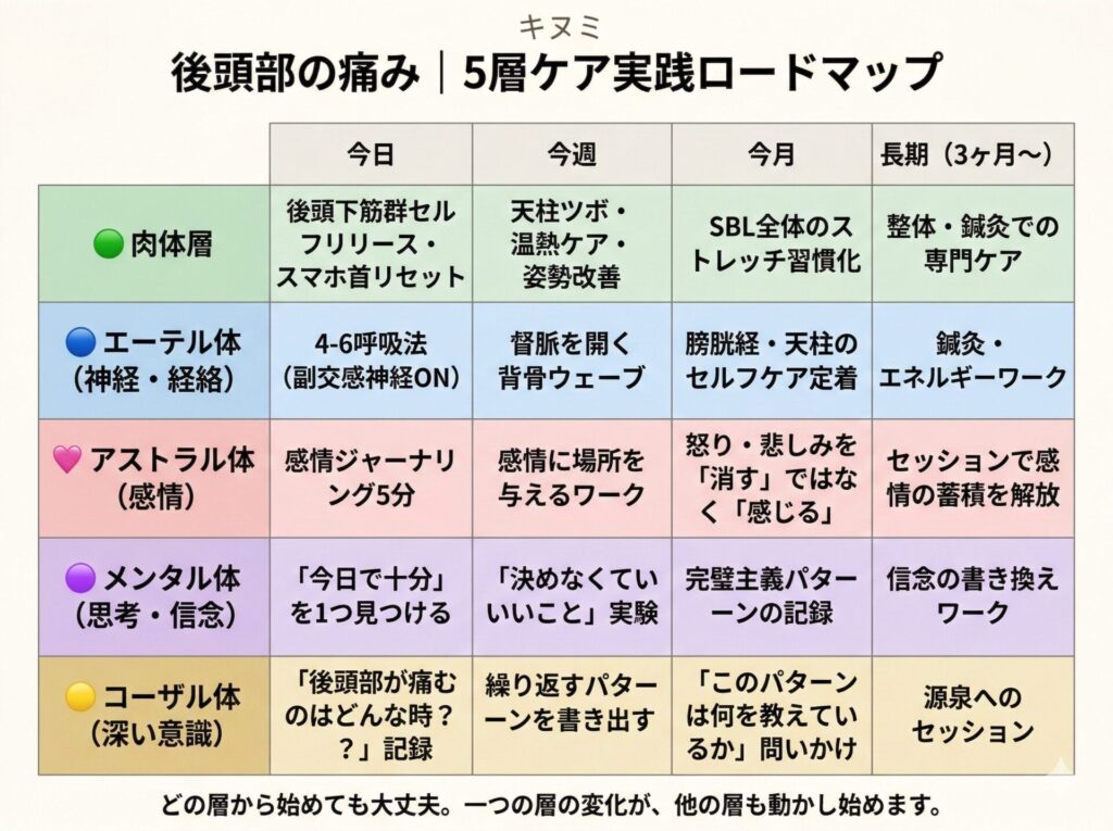 肉体層(筋膜ケア・ツボ・姿勢改善)は、セルフケアで変化を実感しやすい層です。今日から始められます。