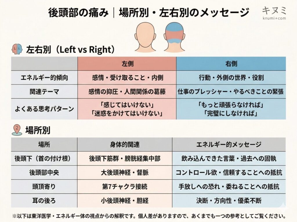 右側の後頭部の痛み エネルギー的には、右側は「男性性・行動・外側の世界・父性」と関連するという見方があります。「仕事・社会的役割・行動・やるべきこと」への過剰な緊張が右側に現れやすいとも言われます。「やらなければならない」というプレッシャーが強い時期に右側が痛む方が多い印象があります。