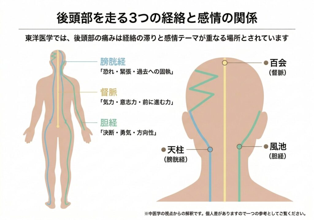 東洋医学的な視点から後頭部の痛みを読み解くと、主に3つの経絡が関与しています。